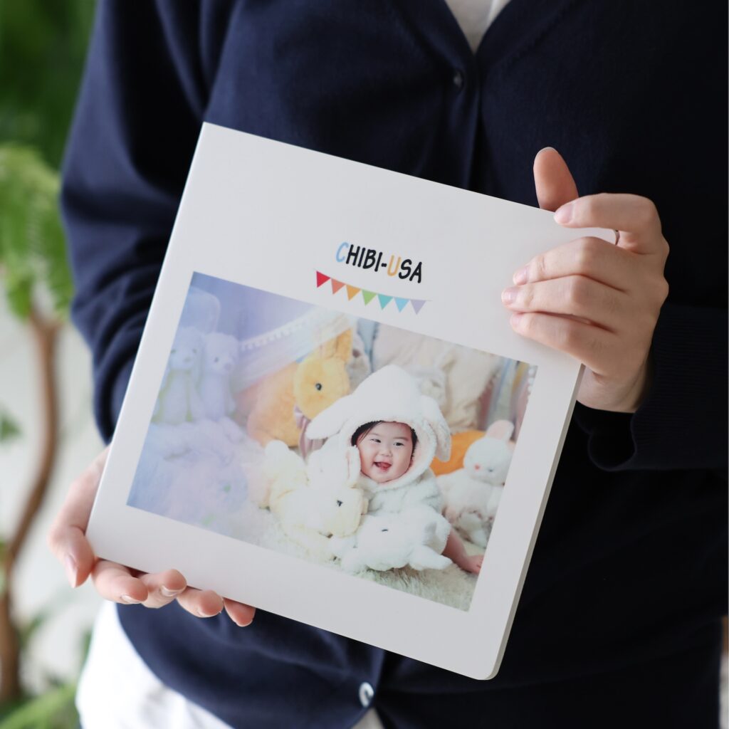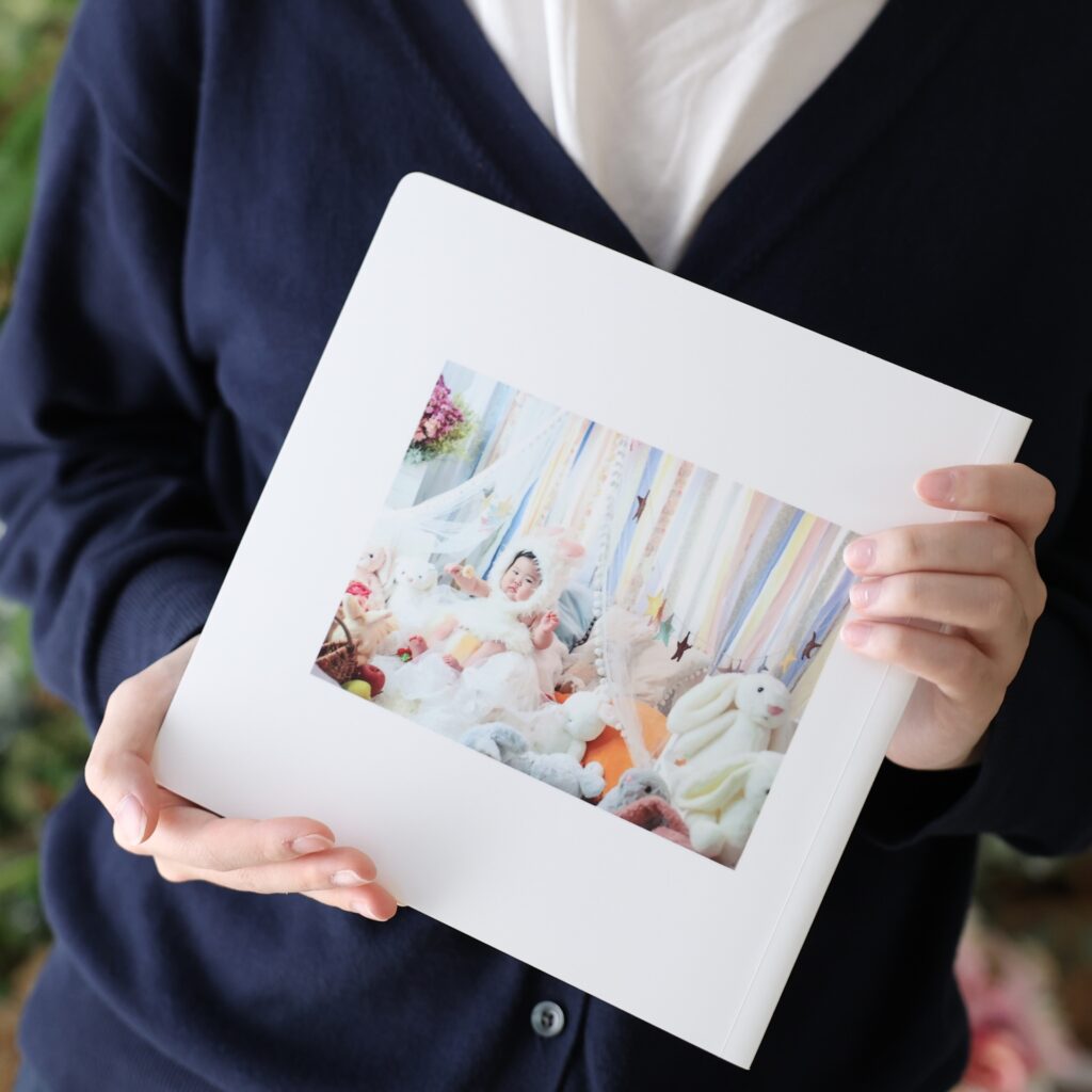 21cm角のフォトブックです。お子様が触っても手のあとがつかない仕様。
